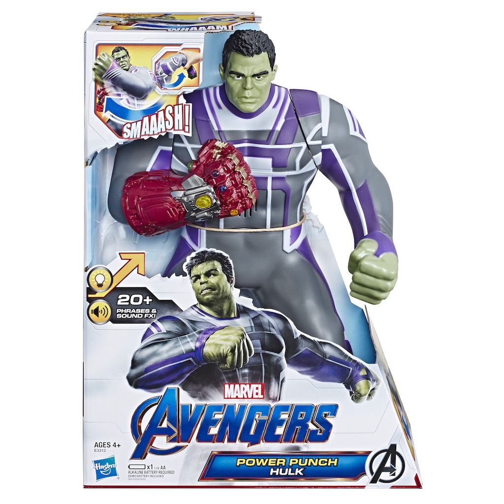 - The Marvel Avengers: Endgame Power Punch Hulk 14-Inch Figure dons a detailed suit and gauntlet inspired by the Avengers: Endgame movie and features over 20 sounds and phrases.