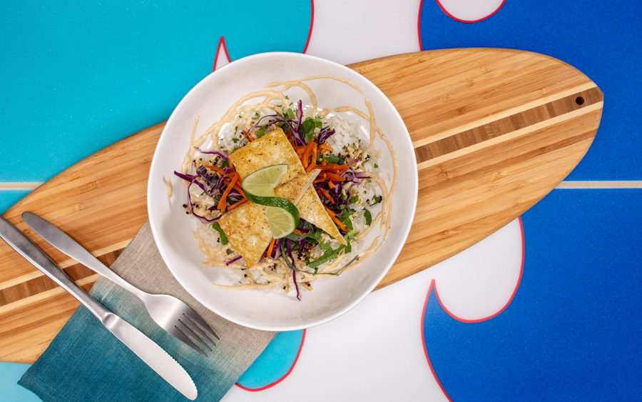 - Tofu Power Bowl with Baja Sauce consisting of cilantro lime rice, quinoa, kale, red cabbage, pickled carrots. (Tofu can be substituted for chicken or carne asada).