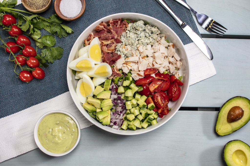 - SoCal Cobb Salad consisting of chopped lettuce, tomatoes, avocado, blue cheese, bacon, hard boiled egg and avocado ranch dressing.
