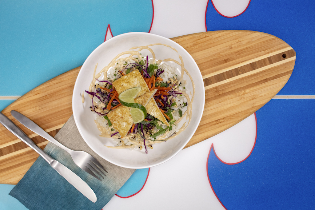 - Tofu Power Bowl with Baja Sauce consisting of cilantro lime rice, quinoa, kale, red cabbage, pickled carrots. (Tofu can be substituted for chicken or carne asada).