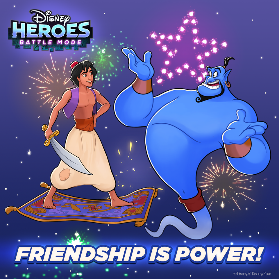 - Players can add Aladdin and Genie to their teams with supercharged boosts, and thanks to the Genie, they can earn double the badge and hero chip drops from elite and normal campaign stages.