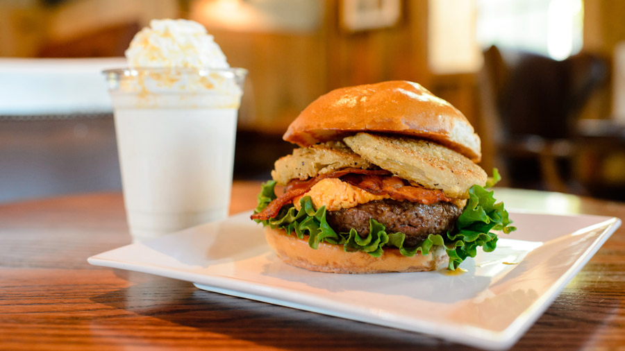 - Southern Burger – Signature beef blend patty topped with a fried green tomato, pimento cheese, lettuce, grilled onion, and bacon