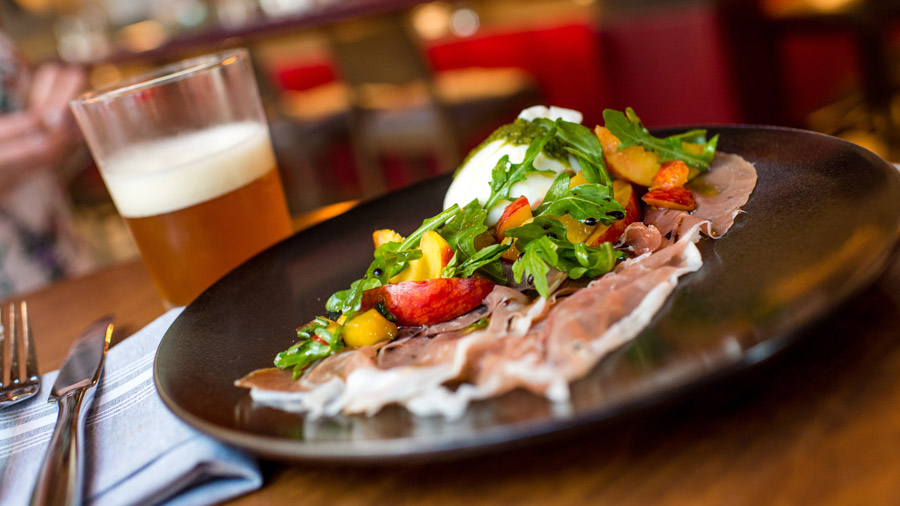 - Local Buratta – Buratta made in Pompeo Beach, Florida served with prosciutto, arugula, fresh peaches, and basil pesto