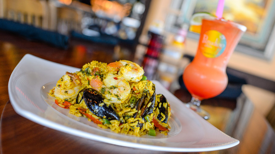 - Florida Scorpion Shrimp Paella – Colossal gulf shrimp, mussels, pancetta, peas, crushed red pepper, tomatoes, and savory Key lime butter tossed with Calasparra rice and broiled to perfection