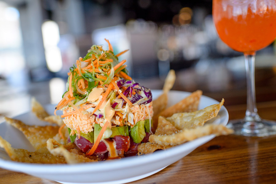 - Tuna Poke Tower – Seared ahi tuna, spicy crab mix, diced Florida avocado, and Asian slaw stacked and served with crispy wonton chips