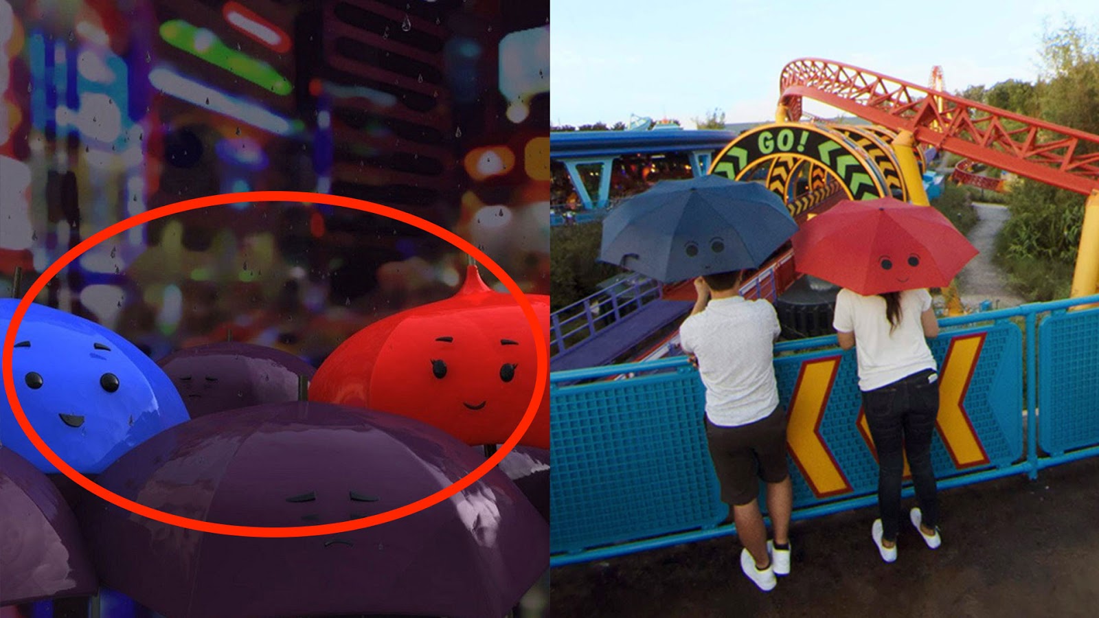 - A pair of guests holding umbrellas in reference to the Pixar Short, “The Blue Umbrella.”