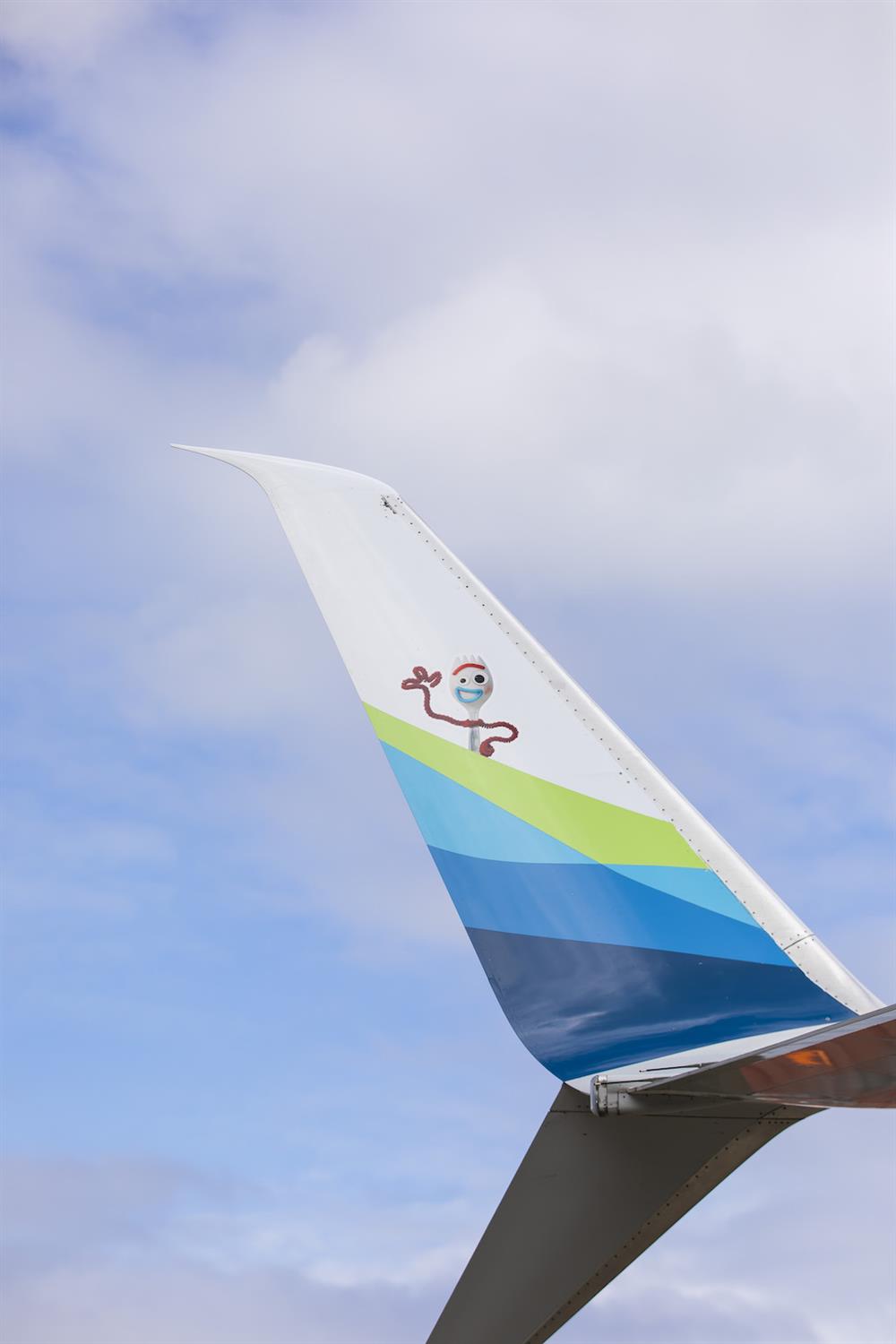 - Woody, Buzz Lightyear and Bo Peep span the fuselage while new toy Forky appears on the winglet, sparking smiles on guests peering out the windows of the aircraft.