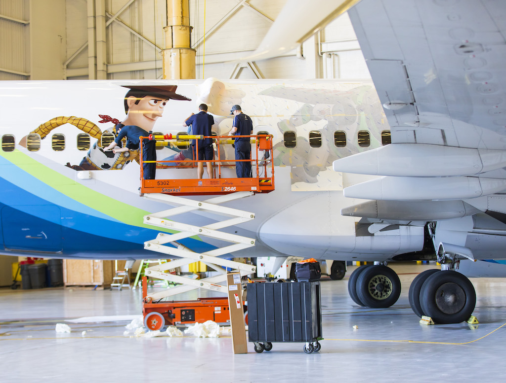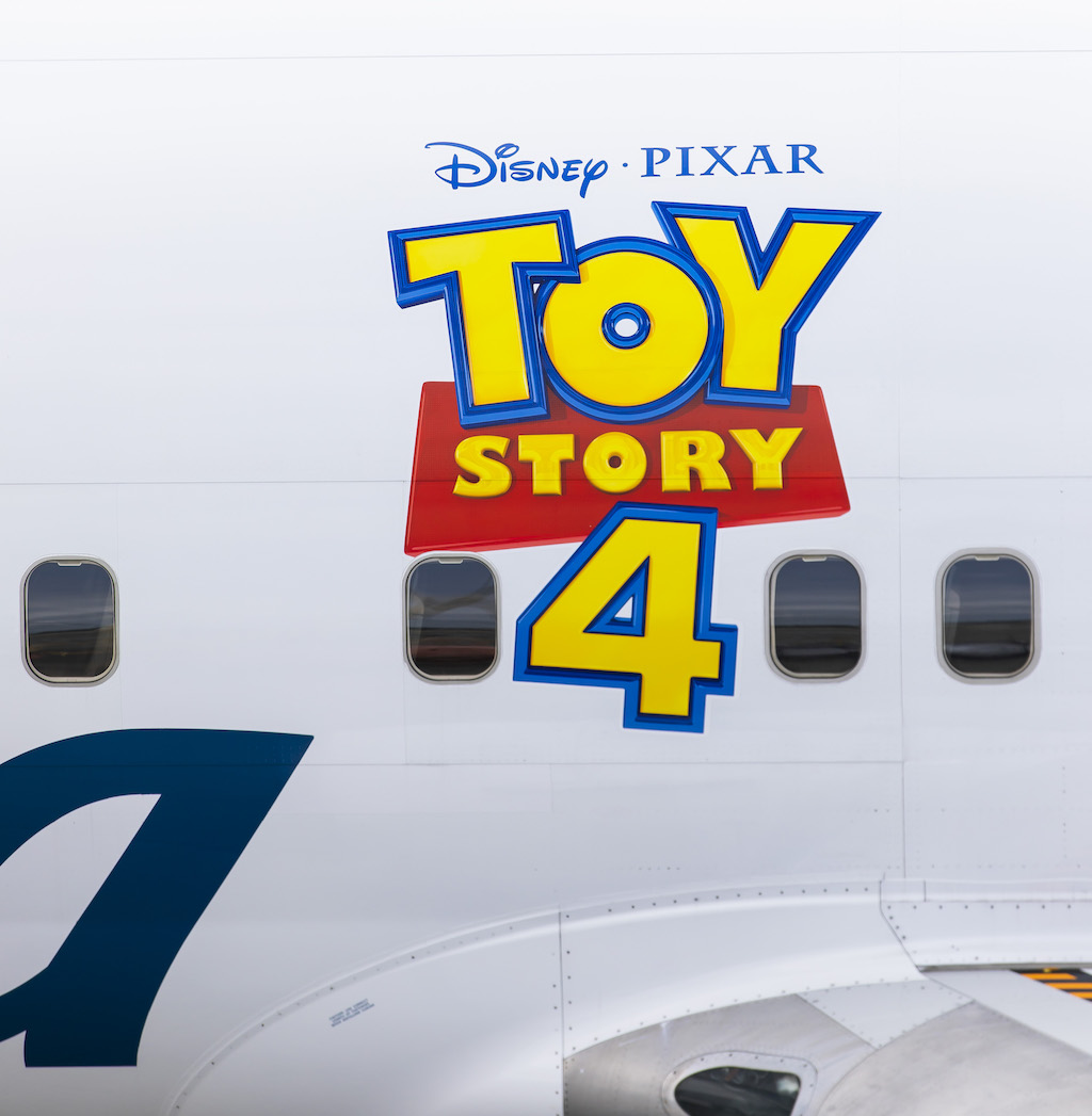 - This unique design is a collaboration between Disney, Pixar and Alaska Airlines. Guests boarding the Toy Story 4 aircraft will also see a logo.