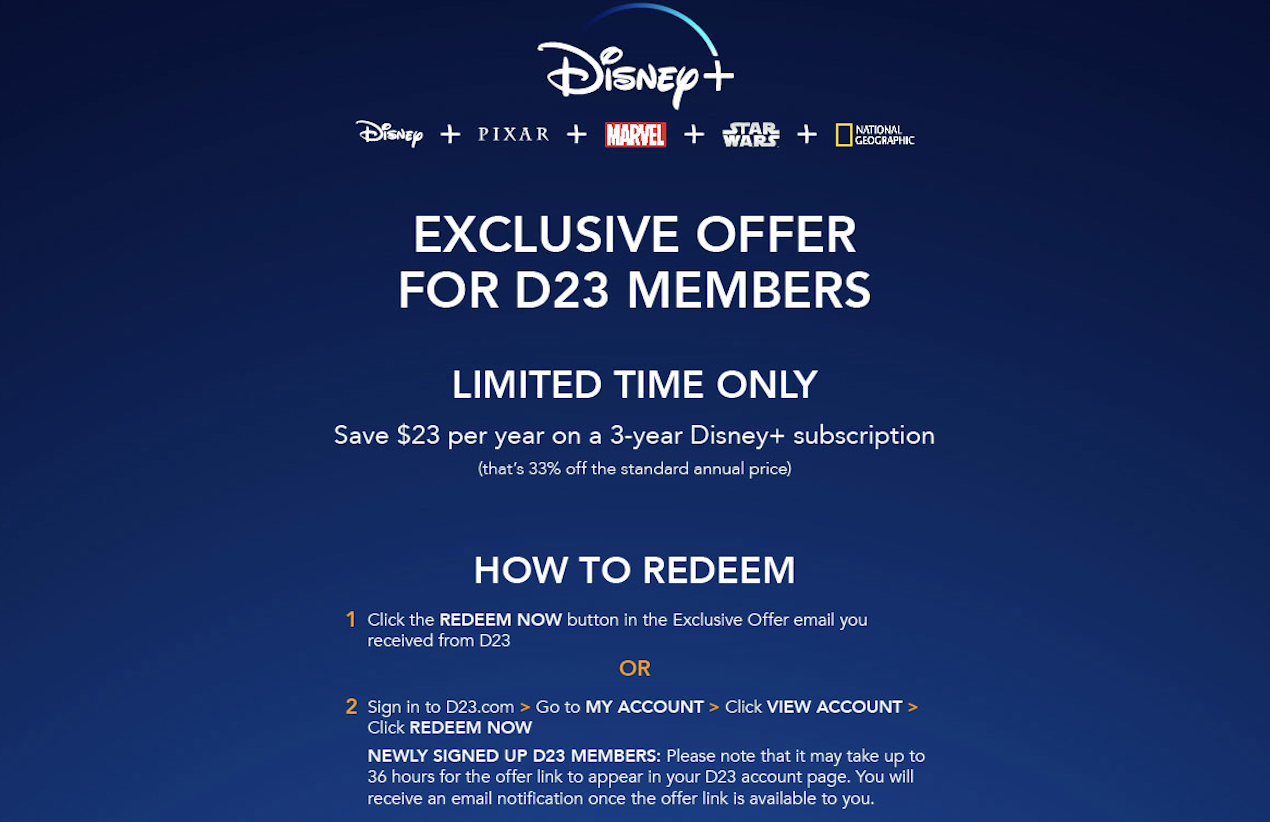 - D23 Members who were not able to attend the D23 Expo 2019 or were not able to sign up a the Disney+ pavilion, are still able to take advantage of the special promotional subscription offer.