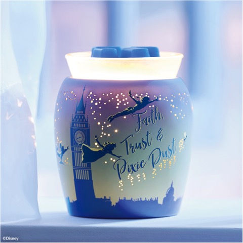 When the collection first debuted, it was announced that Scentsy would not be doing Scentsy Warmers in the Disney Collection. That all changes on September 1st with “Tinker Bell: Faith, Trust, and Pixie Dust” which benefits the Make-A-Wish Foundation with $7 from the sale of each warmer becoming a donation. Silhouettes of Peter Pan, Wendy, Michael, and John sail over the london sky with an hombre effect and light shining through as a pixie dust trail.
