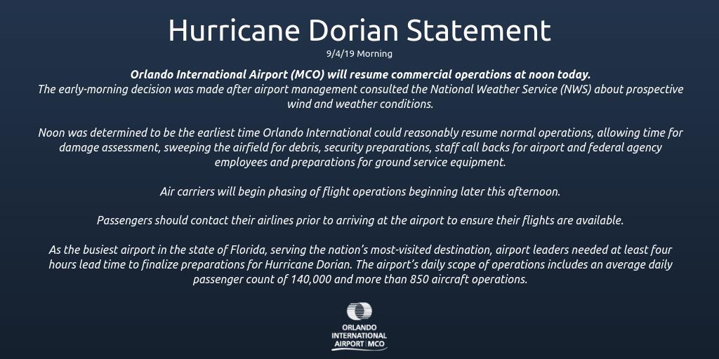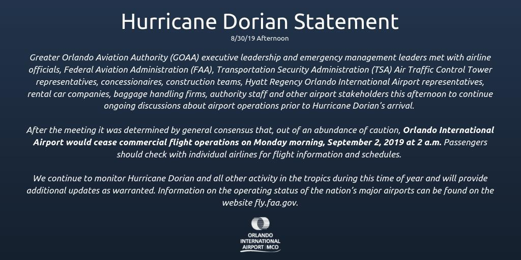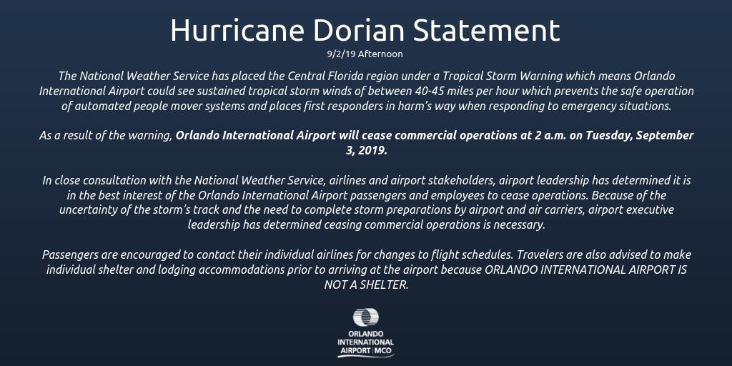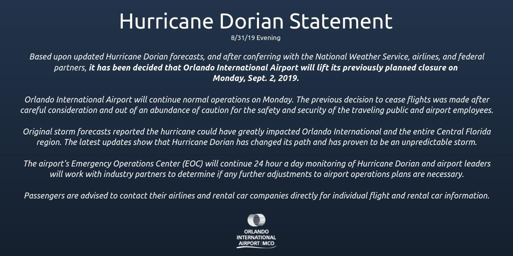 - With the path of Hurricane Dorian seemingly turning, Orlando International Airport (MCO) has announced that it will continue to operate on Monday, September 2nd.