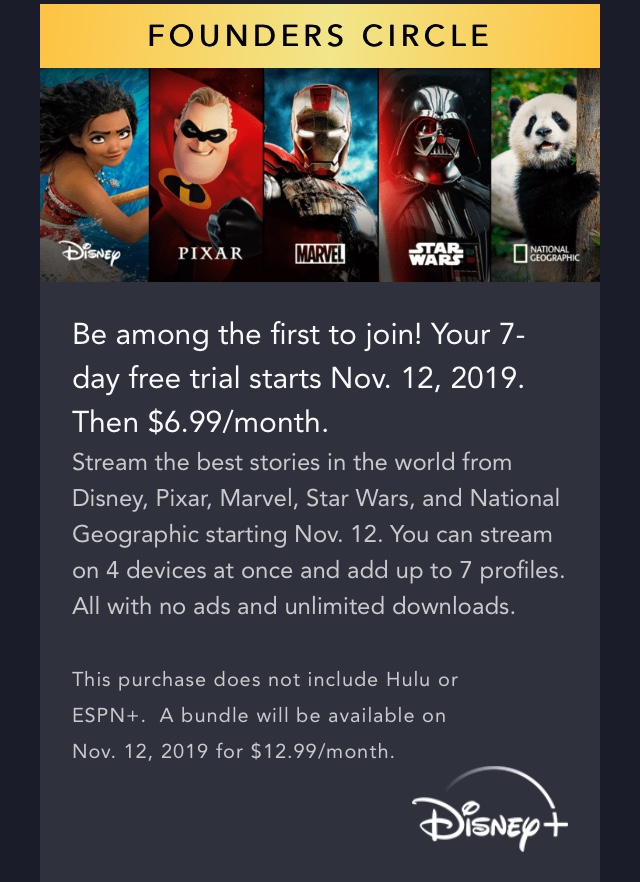 - By selecting either a monthly plan for $6.99 or a yearly plan for $69.99, fans can join what Disney has called the “Founders Circle” for the streaming service.