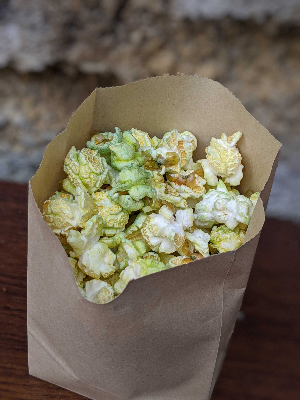 - The green popcorn doesn’t seem to have any unique flavors or seasonings, just a fanciful green color.