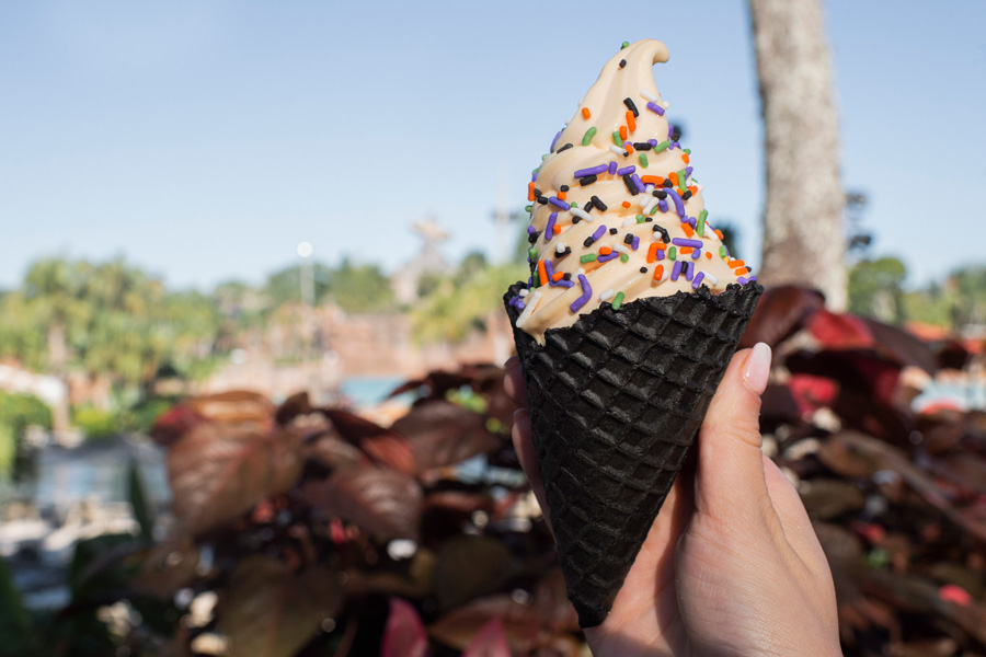 - I-Scream Cone – Orange Dole Whip Soft Serve, a sandwich cookie waffle cone, colorful Halloween sprinkles and a white chocolate surfboard