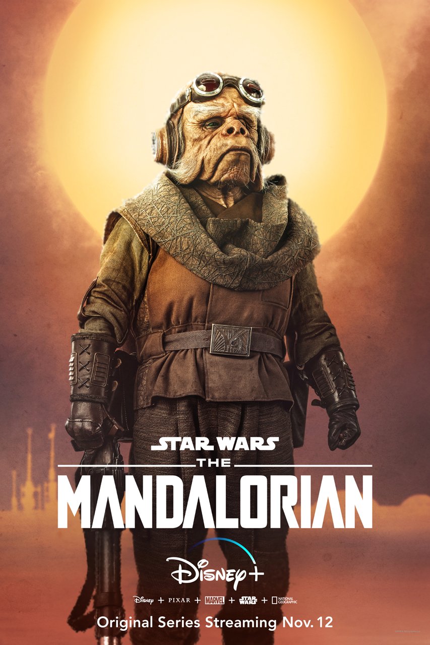This morning, the official Twitter feed for The Mandalorian also revealed five new character posters for the series, including the one featuring Pedro Pascal as the masked title character in the image above. The remaining four showcase Gina Carano (Deadpool) as Cara Dune, Carl Weathers (Toy Story 4) as Greef Carga, Taika Waititi (Thor: Ragnarok) as the voice of assassin droid IG-11, and the Ugnaught character named Kuiil.