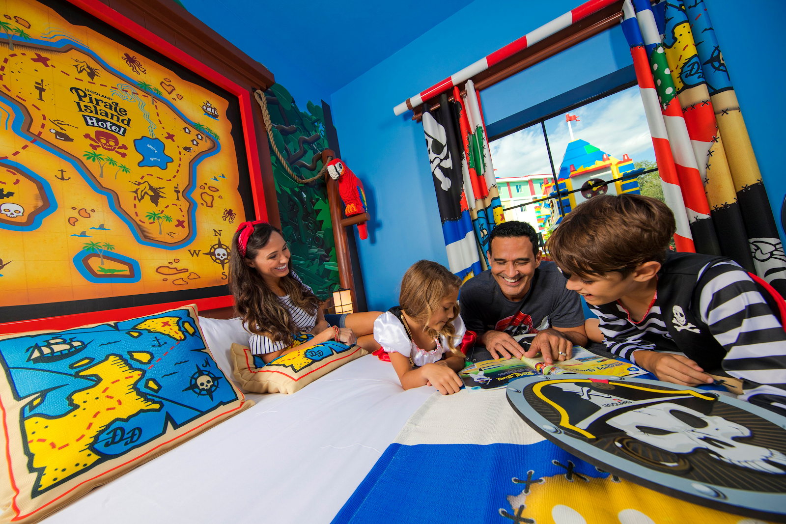 - Located just 130 kid-steps from the theme park entrance, LEGOLAND Pirate Island Hotel will feature 150 LEGO-filled rooms (including four suites), a heated pool (complete with LEGO soft bricks to build in the pool), hundreds of LEGO models, in-room LEGO treasure hunts and exclusive character experiences. Similar to the popular LEGOLAND Hotel, each room will include two separate spaces: a kid’s sleeping area and an adult area.
