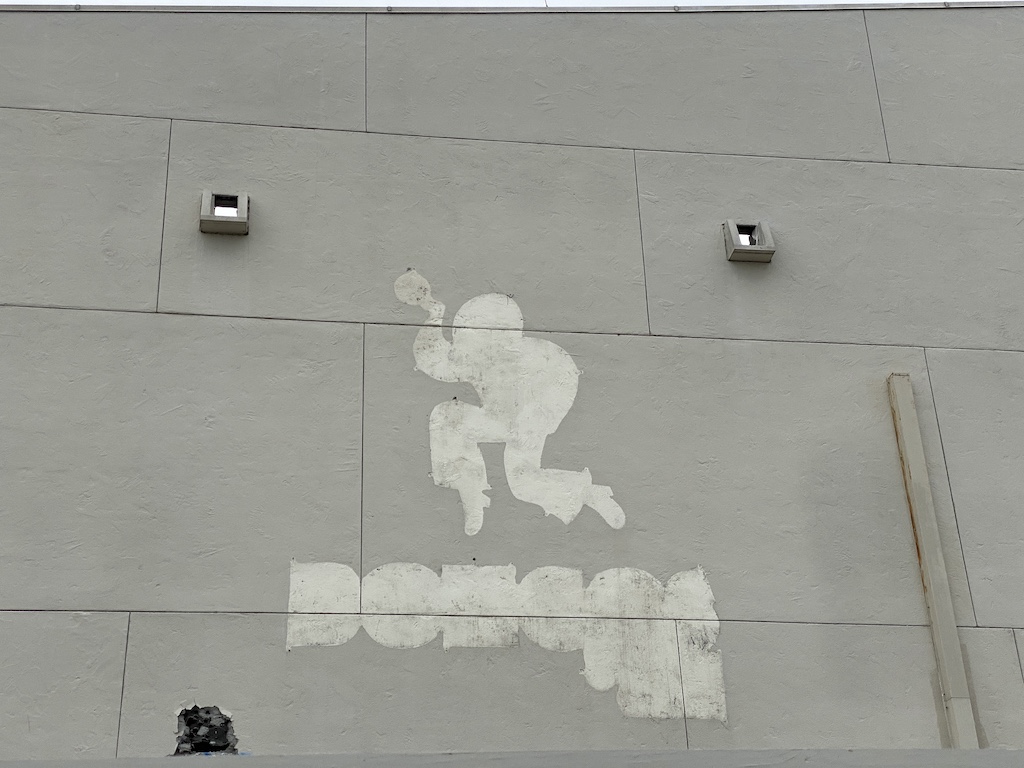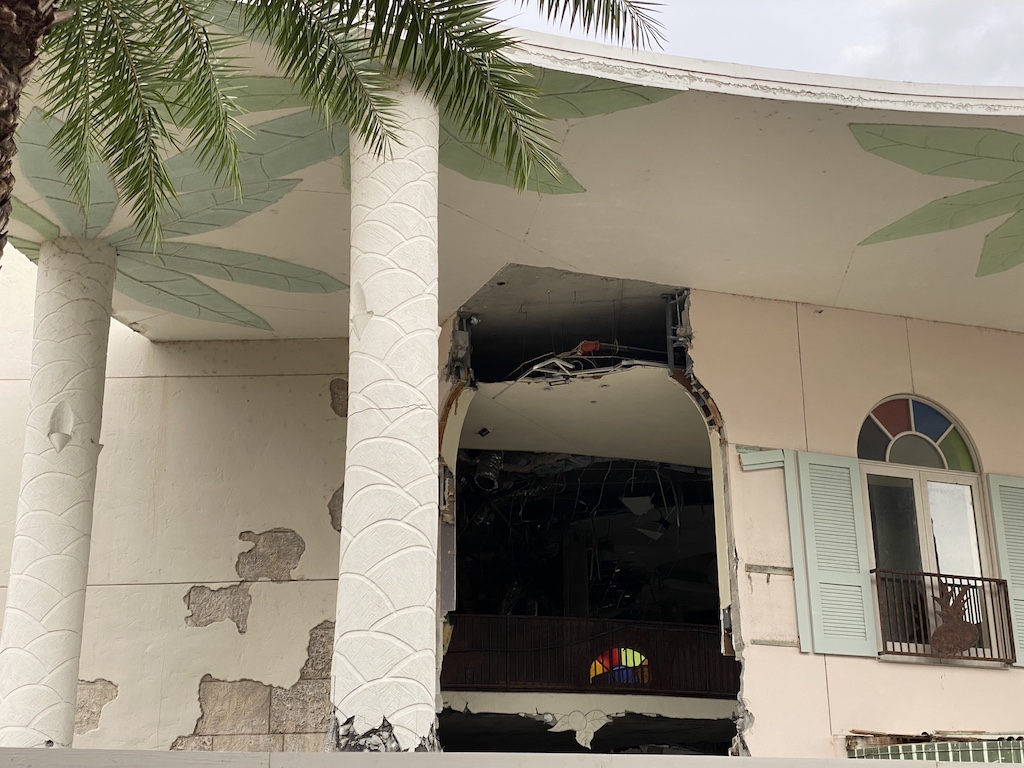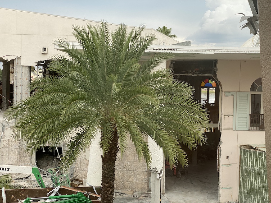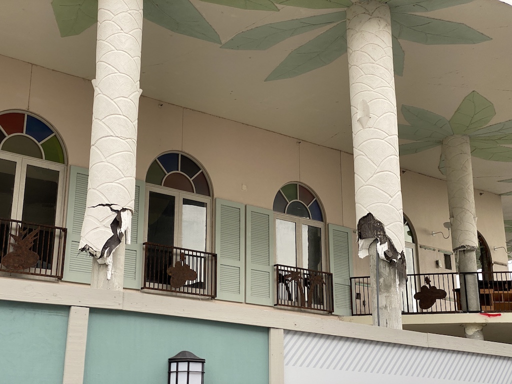 - Back on the ground, we can see the old Bongos patio balcony and the round columns that were designed to look like palm trees.