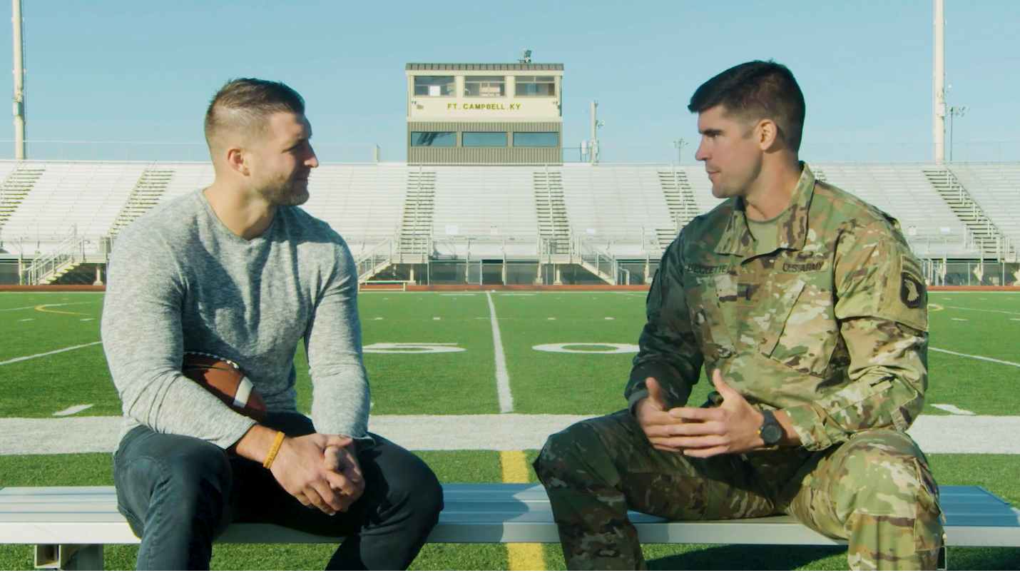 - Tim Tebow is reunited with Jake Bequette, a former SEC All-Conference Defensive End who sacked Tebow twice in college, a Super Bowl winner with the New England Patriots and now, a 2nd Lieutenant in the U.S. Army, just returning to Fort Campbell following a tour in the Middle East.