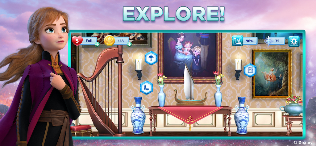 In a step forward for match-three decoration experiences, Disney Frozen Adventures shifts the perspective of the game, putting players into the rooms they decorate and explore. Jam City designed the game putting players at “eye-level” within environments to create an immersive point of view rather than looking down at the action. - The 3D nature of the game allows players to pan around the room to better explore their surroundings and choose their favorite decorative options.