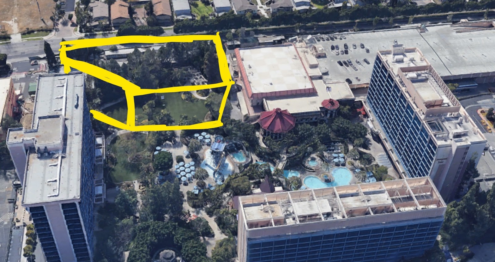 - The project area for the new tower is located in a grassy area between South Walnut Street and the Frontier Tower of the Disneyland Hotel, with a laundry facility and adjoining fitness center being the only pre-existing building to be affected based on the proposal.