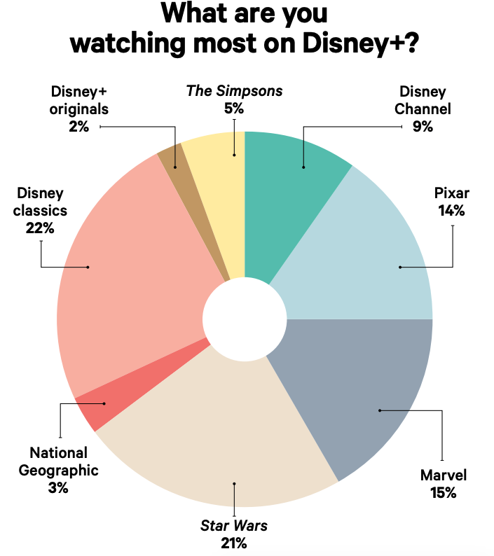 - As you can see in the chart above, only 2% of subscribers said “Disney+ originals” are what they are watching most, while 22% chose “Disney classics.”