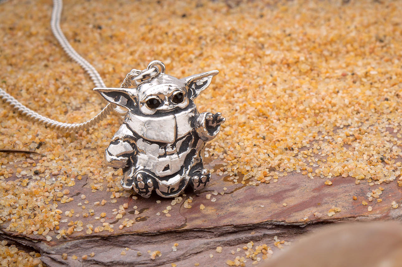 With each passing day, it seems that more and more merchandise featuring the internet phenomenon, The Child (or “Baby Yoda”) from the Disney+ original series, The Mandalorian becomes available. Today, StarWars.com shared a look at a new necklace so you too can wear your love of the mysterious and adorable new character.