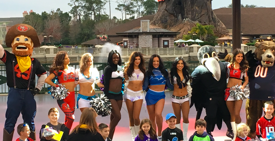 - NFL team mascots and cheerleaders will come together to hype up the crowd for the game with a night of dancing, NFL and Disney trivia, food and beverage, and NFL merchandise.