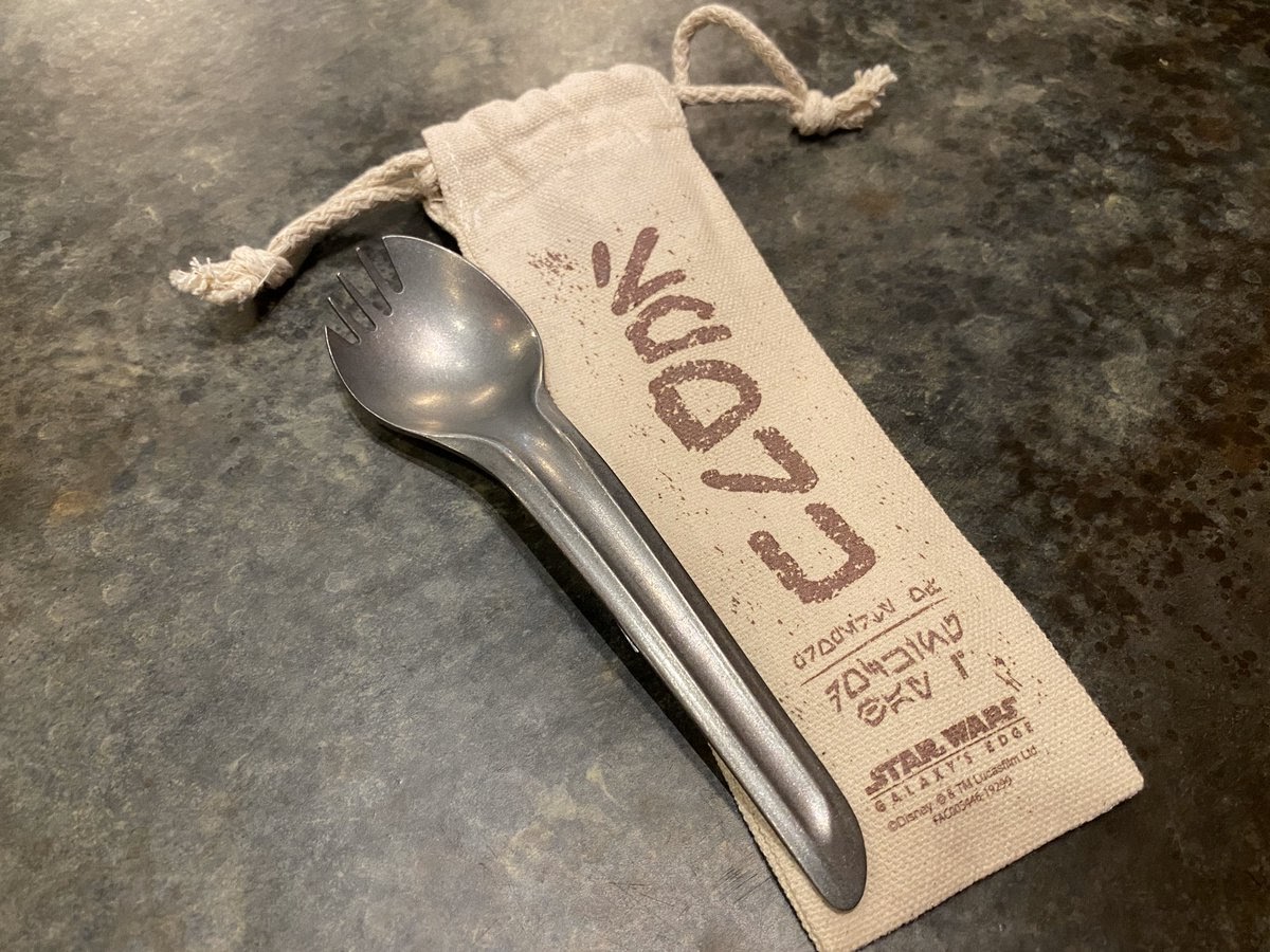 - These metal sporks come in a special pouch with Aurebesh writing that reads “Spork” and “Property of Docking Bay 7,” in addition to a Star Wars: Galaxy’s Edge logo.
