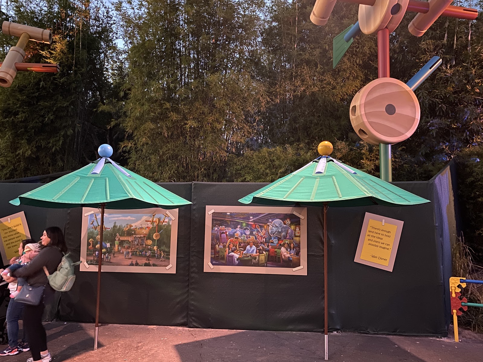 The wall includes two pieces of concept art and a note with a quote from Walt Disney. The concept art of the interior shows the concept of Andy having set up a rodeo playset with his toys with Guests dining at toy chairs and tables. The other concept art shows the entrance to the restaurant, which is tucked away off the main path and being built over what was previously a backstage area.