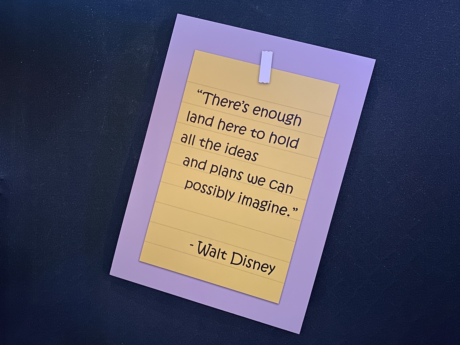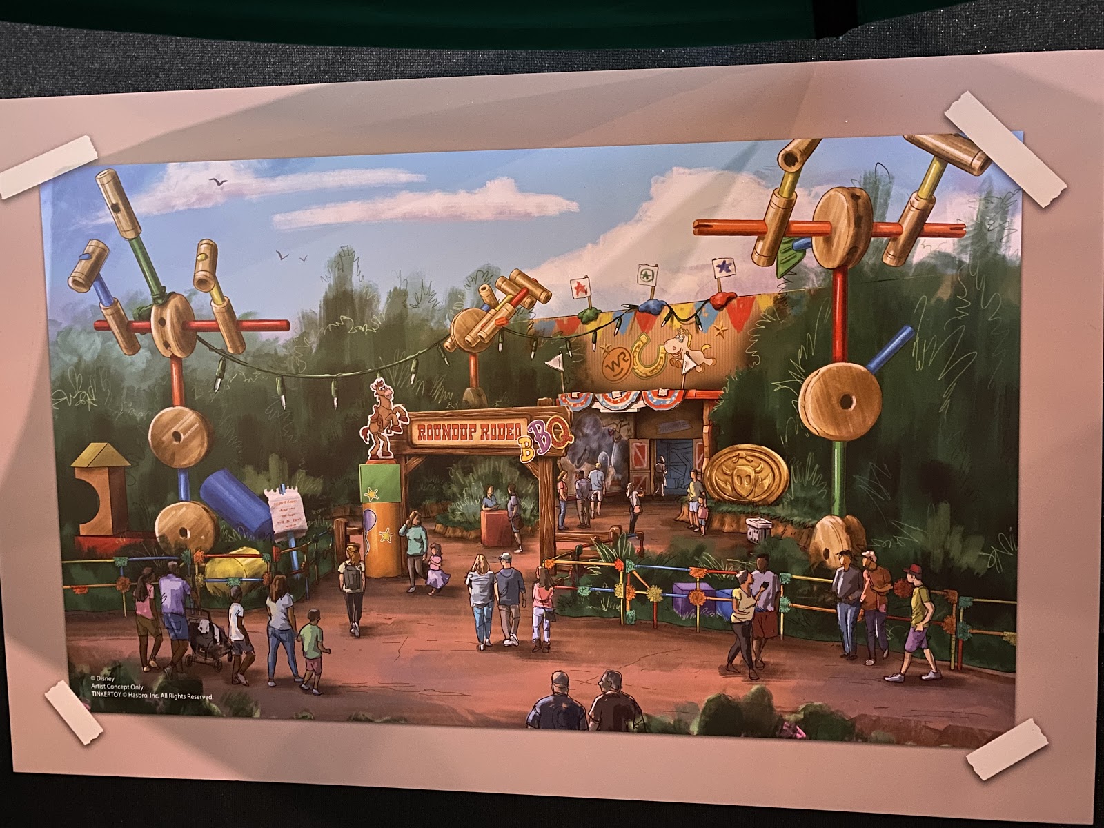The wall includes two pieces of concept art and a note with a quote from Walt Disney. The concept art of the interior shows the concept of Andy having set up a rodeo playset with his toys with Guests dining at toy chairs and tables. The other concept art shows the entrance to the restaurant, which is tucked away off the main path and being built over what was previously a backstage area.