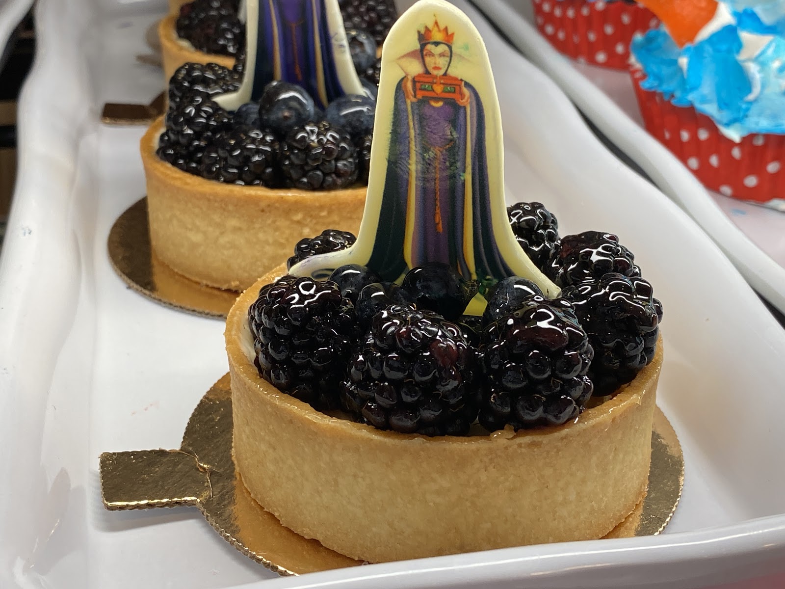 - Surprisingly lacking on the apple, The Evil Queen fruit tart is an almond cake baked tart with blueberry and raspberry with a white chocolate garnish featuring the once fairest one in the land.