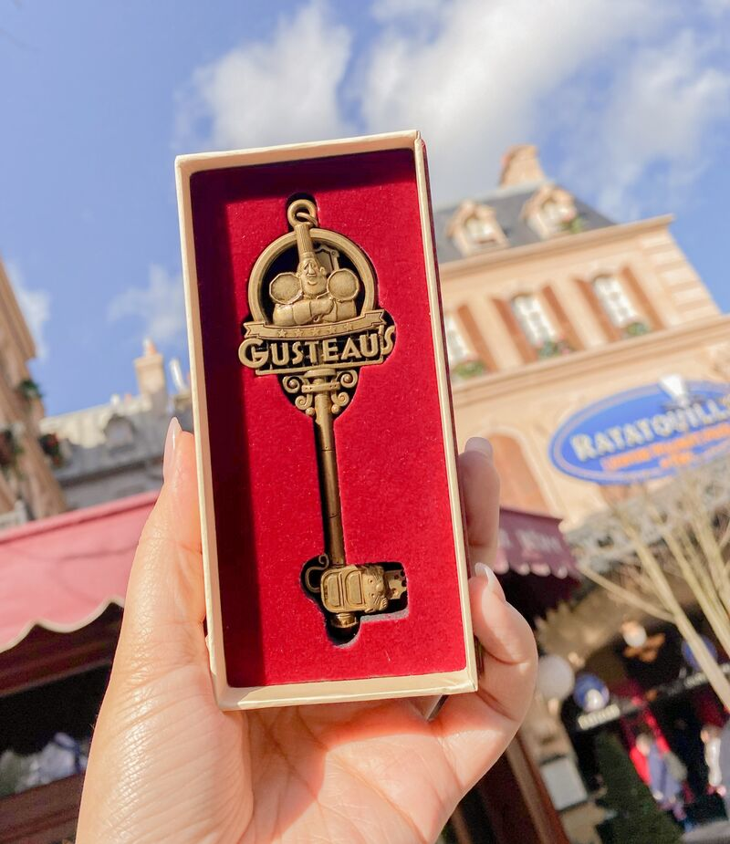 - The key, a copper-ish color, is emblazoned with the Gusteau’s restaurant billboard logo at the end of the key, and one of the rat ride vehicles featured in the attraction as the teeth of the key. The Gusteau’s billboard stands out to guests as it comes to life in the attraction’s queue much like it did to Remy in the film.