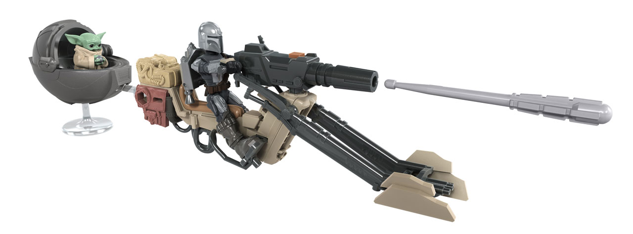 One of the launch figures in a new Hasbro toy line called Star Wars: Mission Fleet includes the Mandalorian themed “Battle for the Bounty” set which includes figures of the Mandalorian, aka Din Djarin, the Child, his bassinet, and an articulated battle launcher.