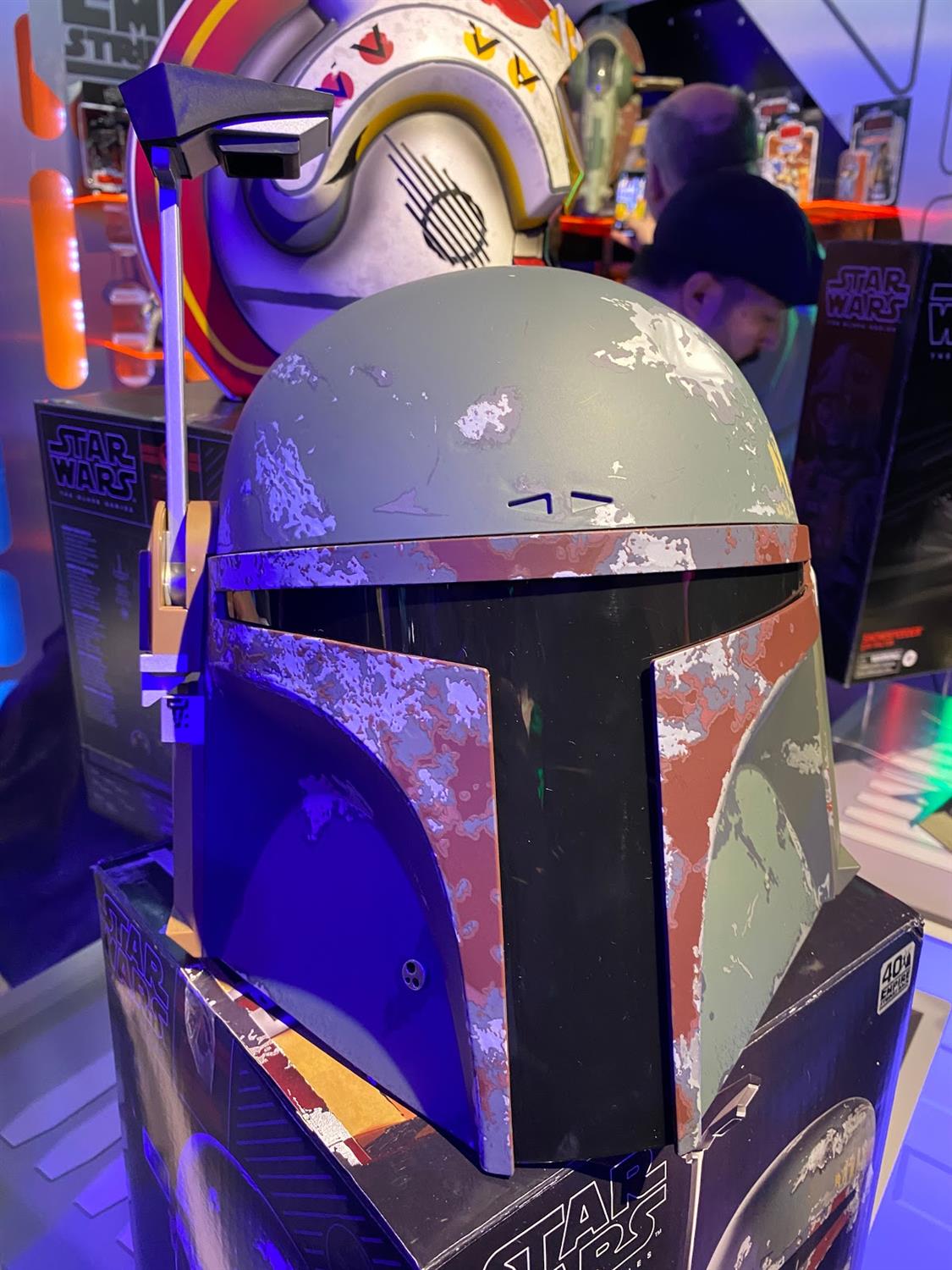 The Black Series Boba Fett Premium Electronic Helmet features premium deco, realistic detail, and movie-inspired design, plus a flip-down viewfinder with flashing LED lights and an illuminated rangefinder HUD.