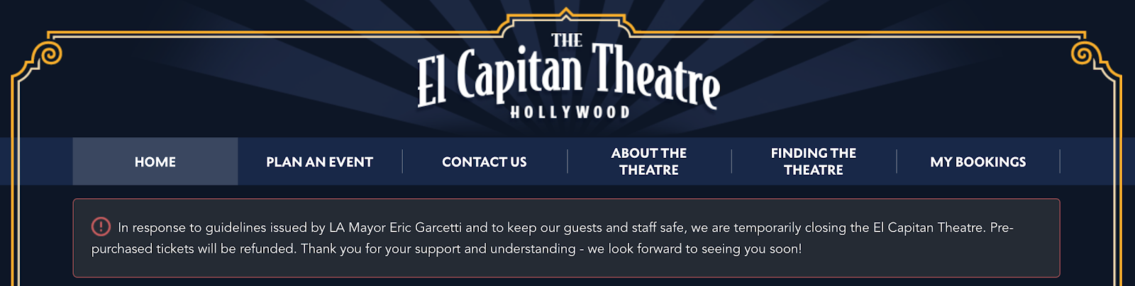 “In response to guidelines issued by LA Mayor Eric Garcetti and to keep our guests and staff safe, we are temporarily closing the El Capitan Theatre. Pre-purchased tickets will be refunded. Thank you for your support and understanding - we look forward to seeing you soon!”