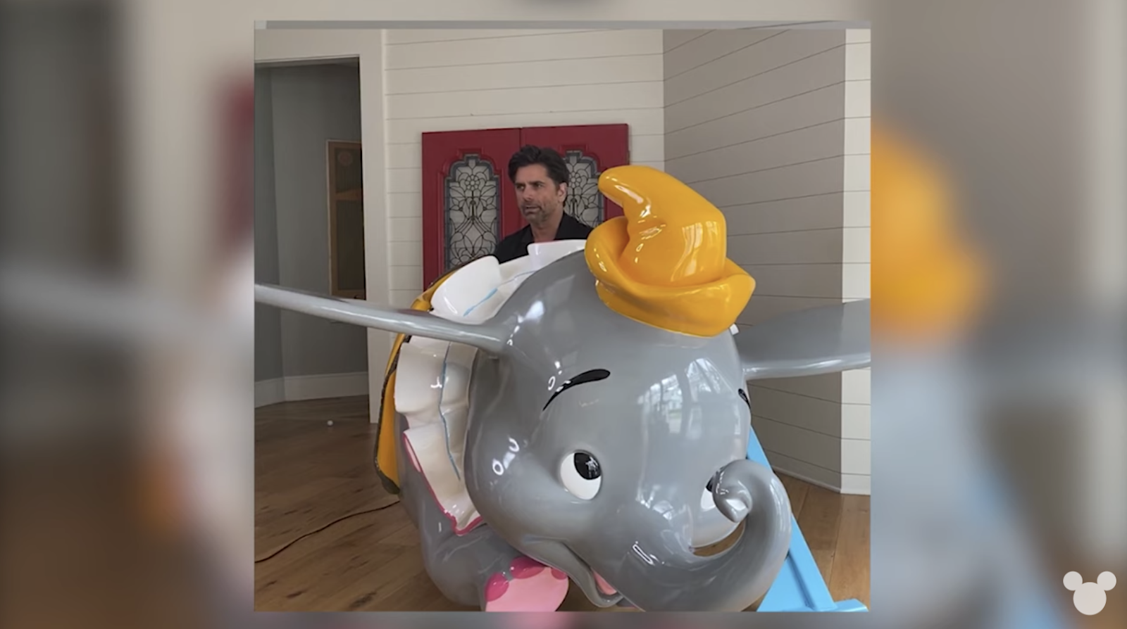 - Did you know that John Stamos is a huge Disney fan? As you can see in the video, he’s sitting in his very own Dumbo vehicle from the classic park attraction, but that’s not all, he even owns the original “D” from the Disneyland sign!