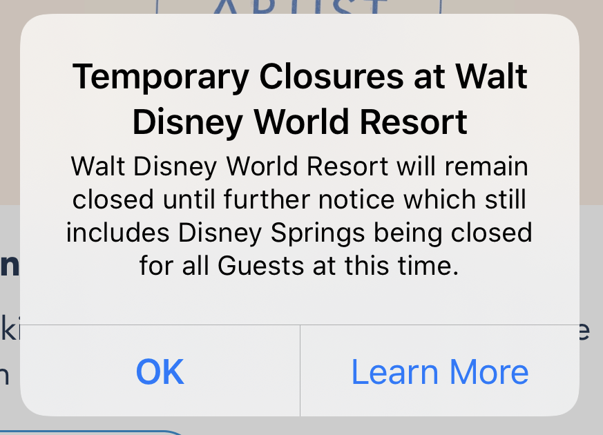 - The update states that Walt Disney World remains closed, specifically calling out Disney Springs as being non-operational.