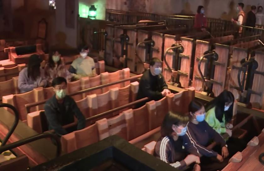 The video shows two different boat attractions with modified seating capacity. Voyage to the Crystal Grotto will not be using the center seating area and has blocked off spaces where Guests can sit around the perimeter of the boat. Pirates of the Caribbean: Battle for the Sunken Treasure has row seating and the attraction will skip rows. As Guests exit the attraction, they are presented with multiple opportunities to sanitize their hands.