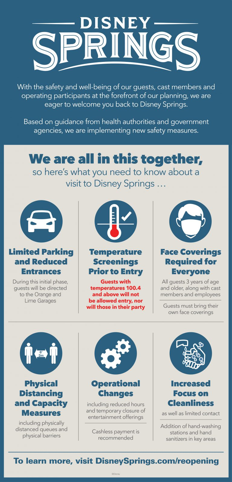 - Guests can visit DisneySprings.com/reopening for additional information and the Disney Parks Blog has shared more “Know Before You Go” important safety tips.
