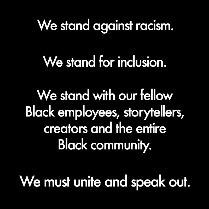 - The message reads “We stand against racism. We stand for inclusion. We stand with our fellow Black employees, storytellers, creators and the entire Black community. We must unite and speak out.”