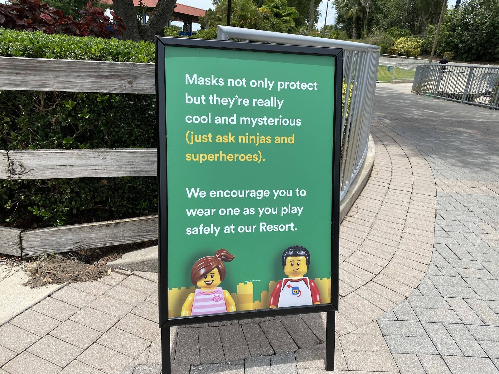 LEGOLAND Florida is in Polk County, which doesn’t have a mandatory face covering policy. Families aren’t required to wear face coverings, but they are encouraged with signage throughout the park. If you didn’t bring them from home, the park offers a disposable mask pickup option. All LEGOLAND employees are required to wear masks.