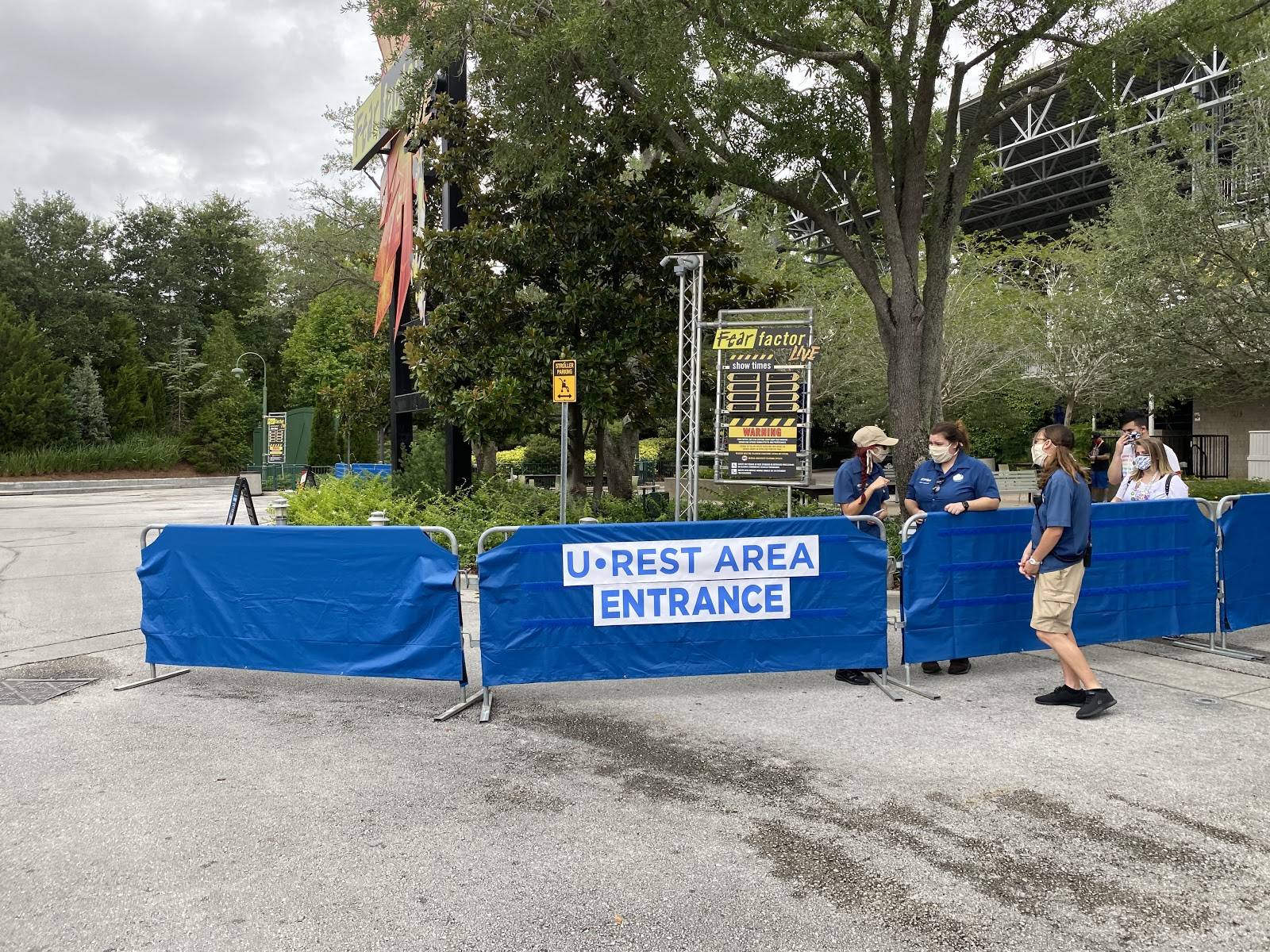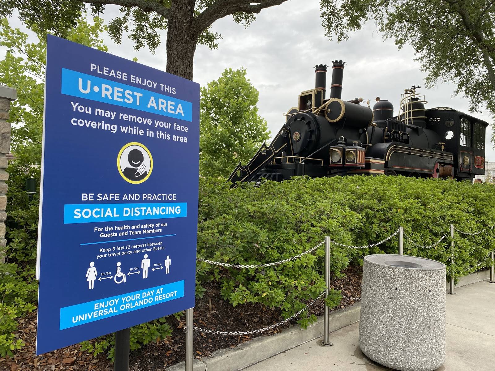 Even though face coverings are required, there are new U-Rest areas scattered throughout the resort (two in each of the parks and one in CityWalk) where you can sit down spaced far enough from someone else and remove your mask. Masks can also be removed while dining at restaurants, and after a guest is safely secured on a water ride (e.g. Jurassic Park River Adventure), but must immediately be put back on before going back into the streets of the park. Masks are also required on the provided transportation to Volcano Bay, but are only highly recommended when not in the water or any water attractions at Volcano Bay.