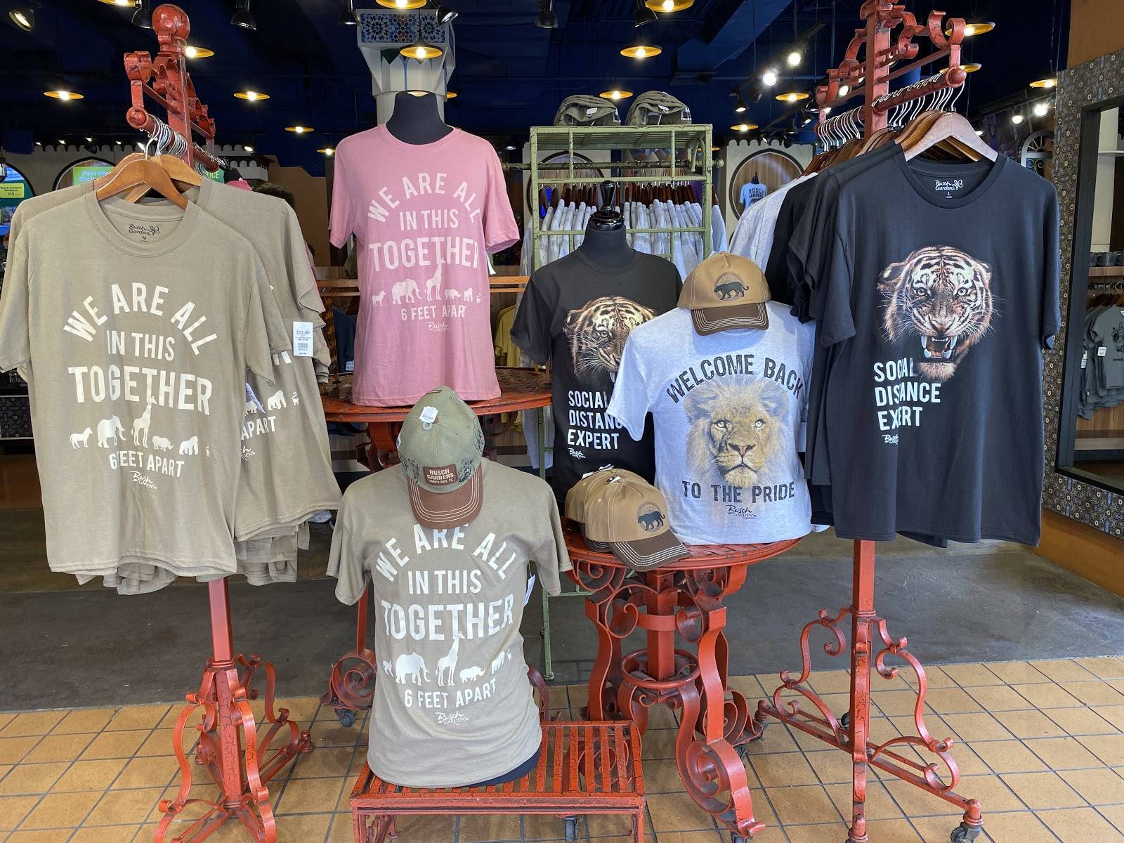 Busch Gardens also sells t-shirts themed to this moment in time, some saying “We are all in this together,” “Welcome back to the park,” and one with a tiger that says “Social distance expert.”