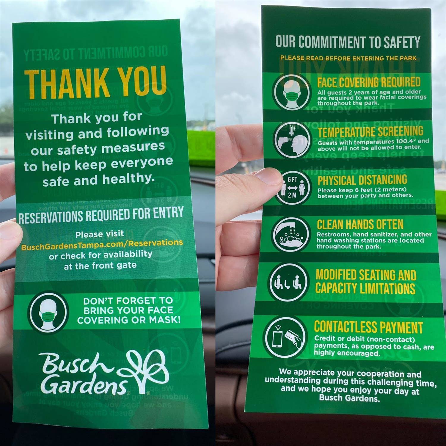 Visitors are given a flyer at the toll plaza that clearly lays out all of the visitor requirements, which include mandatory face coverings, temperature screenings, physical distancing, modified seating, and contactless payment methods.
