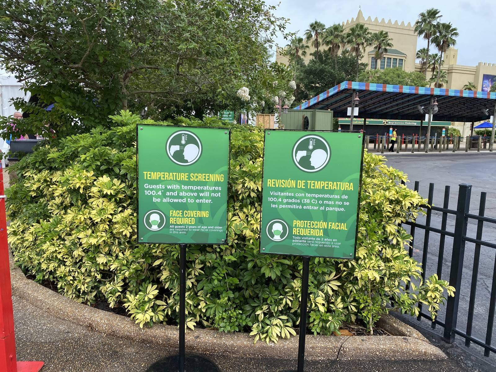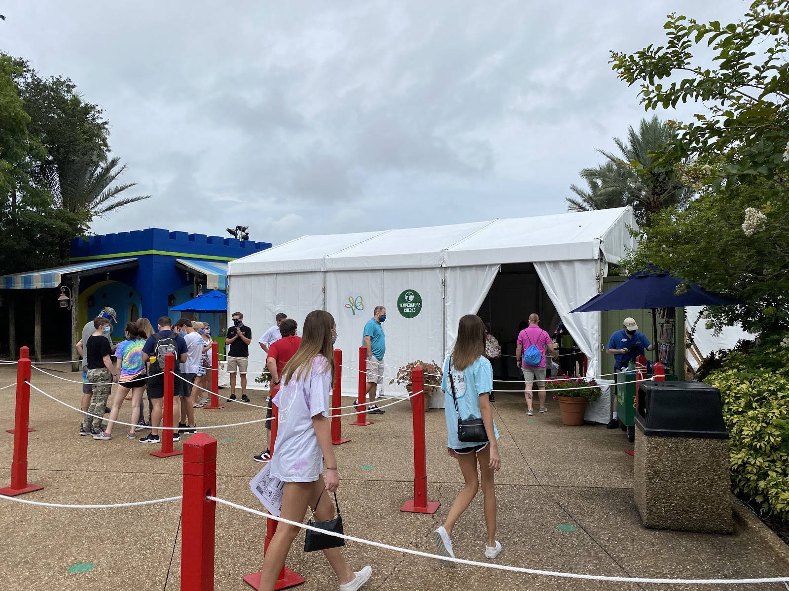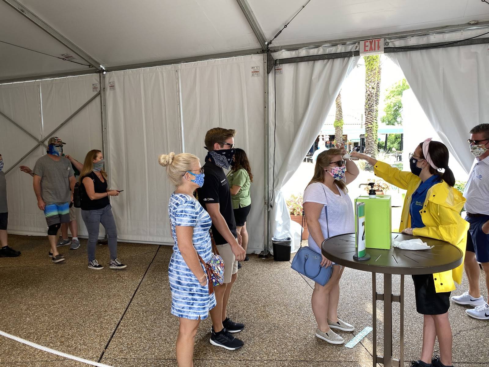 The temperature screening is similar to SeaWorld Orlando’s with a social distancing tent.