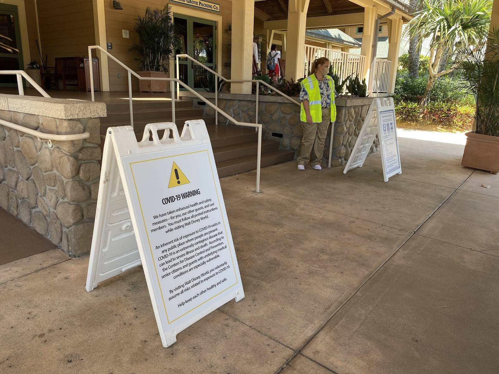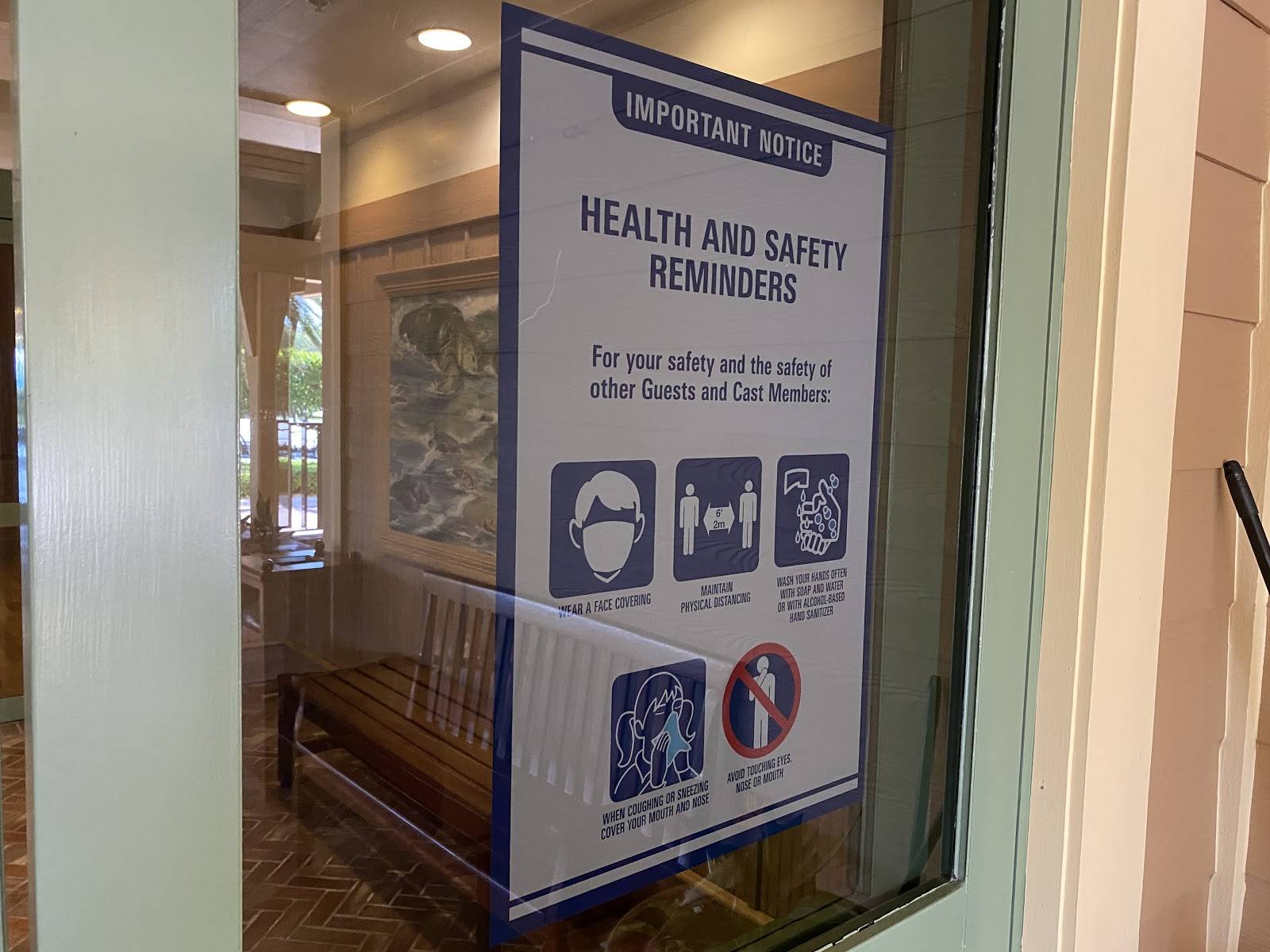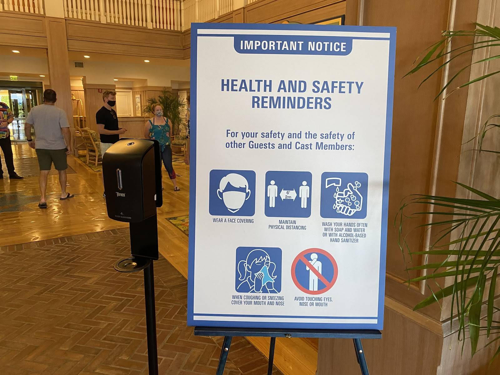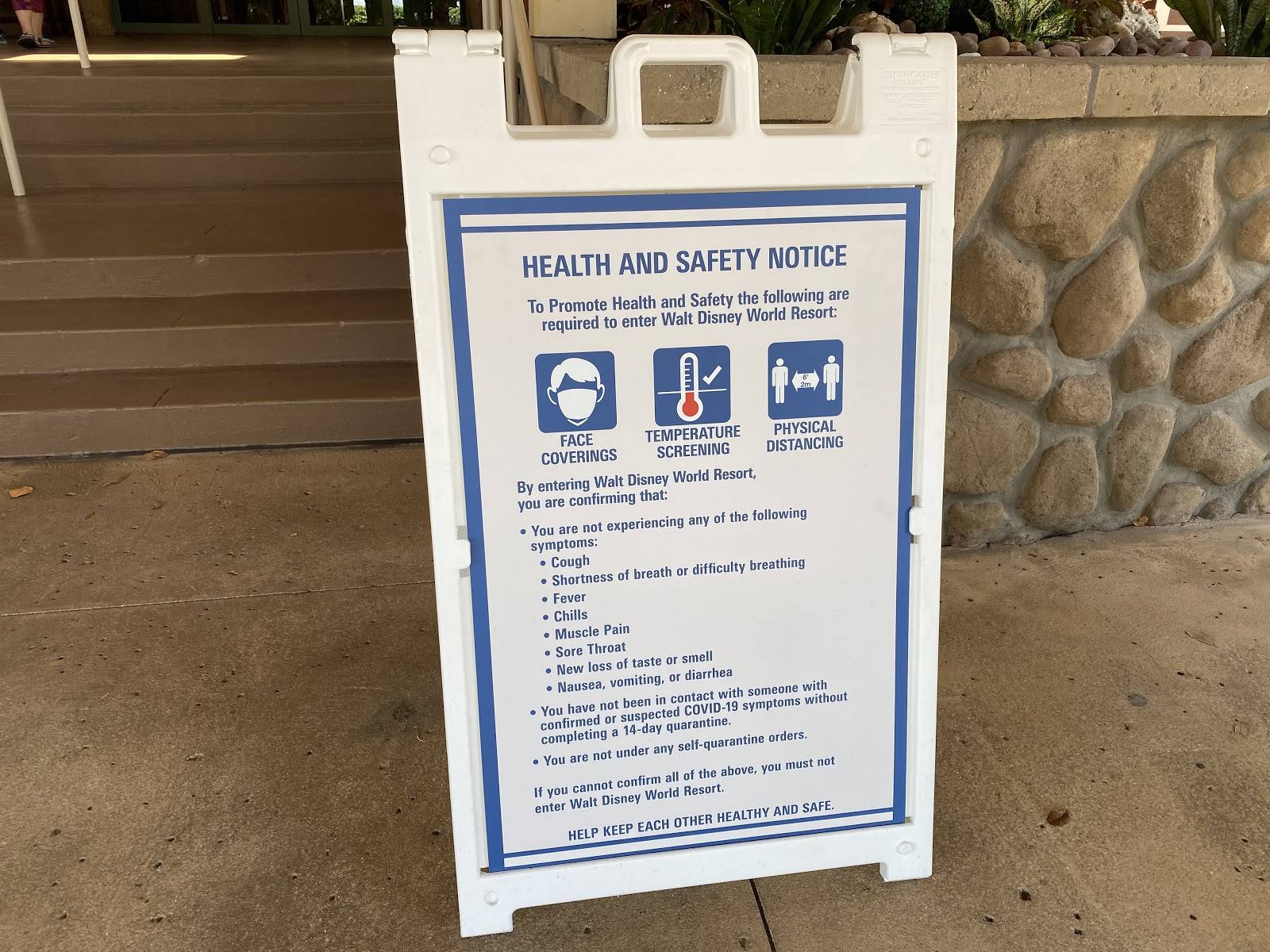 Even before entering the resort, guests will find all kinds of signs referencing the safety precautions staff and guests are expected to take during their visit. Signs reminding guests of the required face coverings, social distancing, hand washing and more can be found just outside the hotel. There was also a sign explaining the rules for visiting Walt Disney World Resort.
