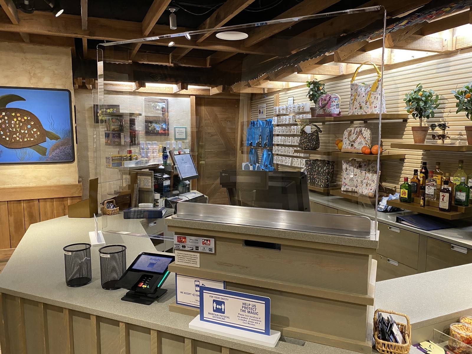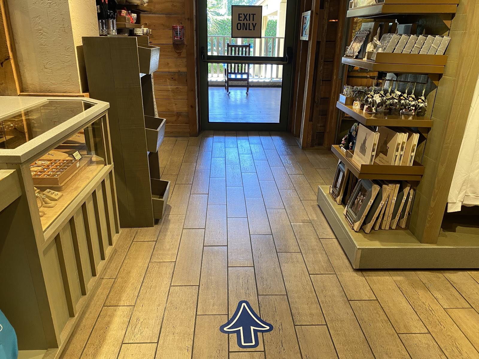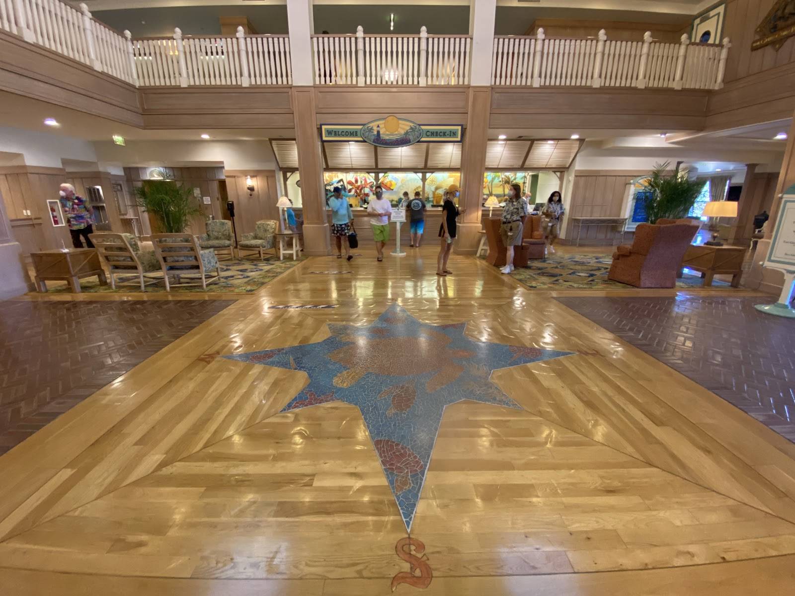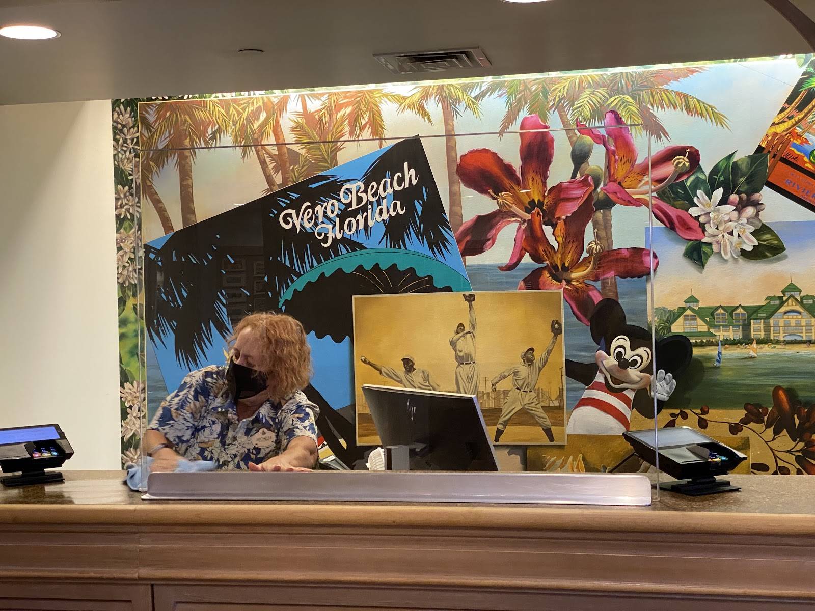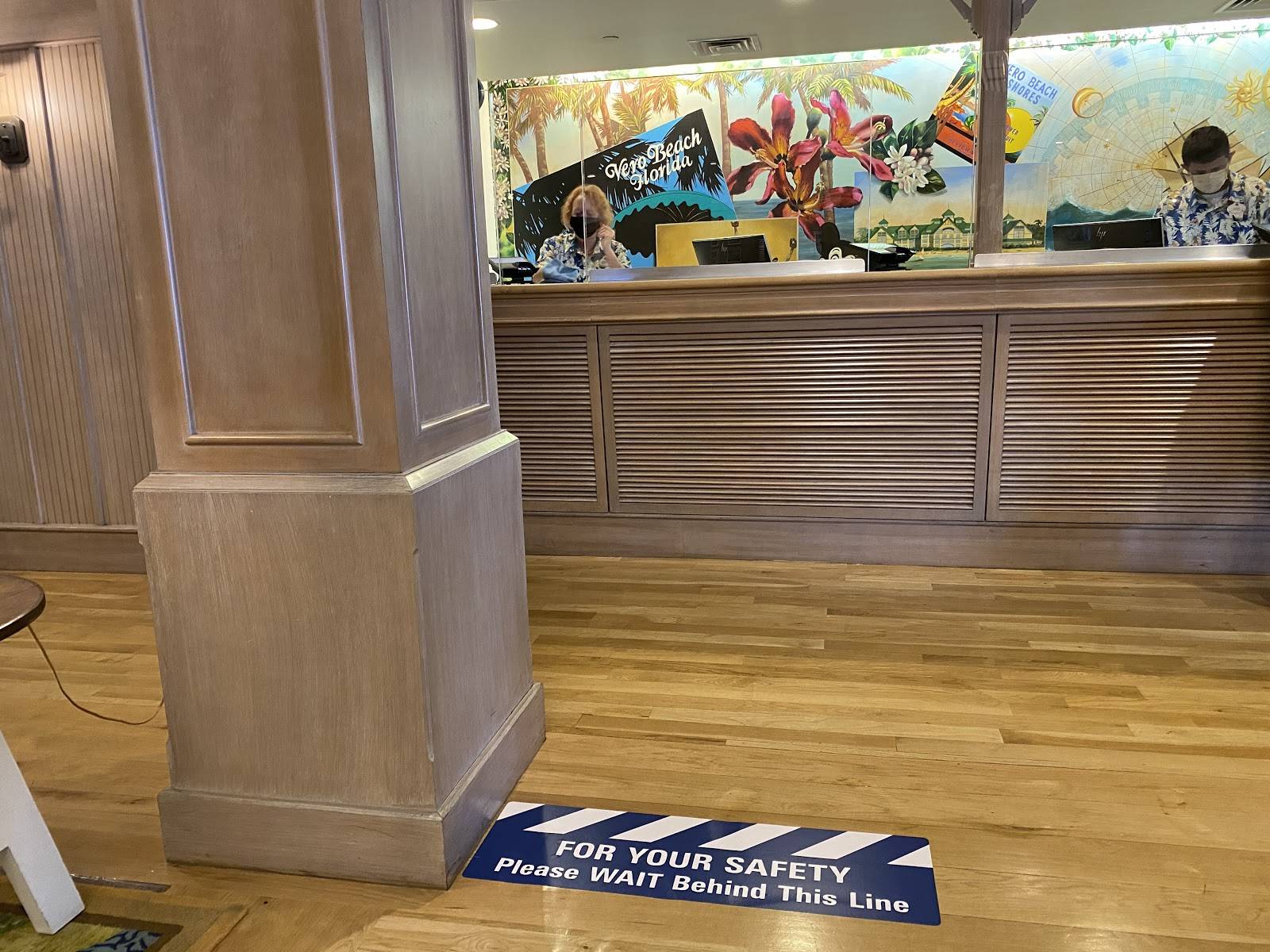 In the lobby, social distancing markers can be found leading to the check-in desk. Cast Members are all wearing face coverings as well.