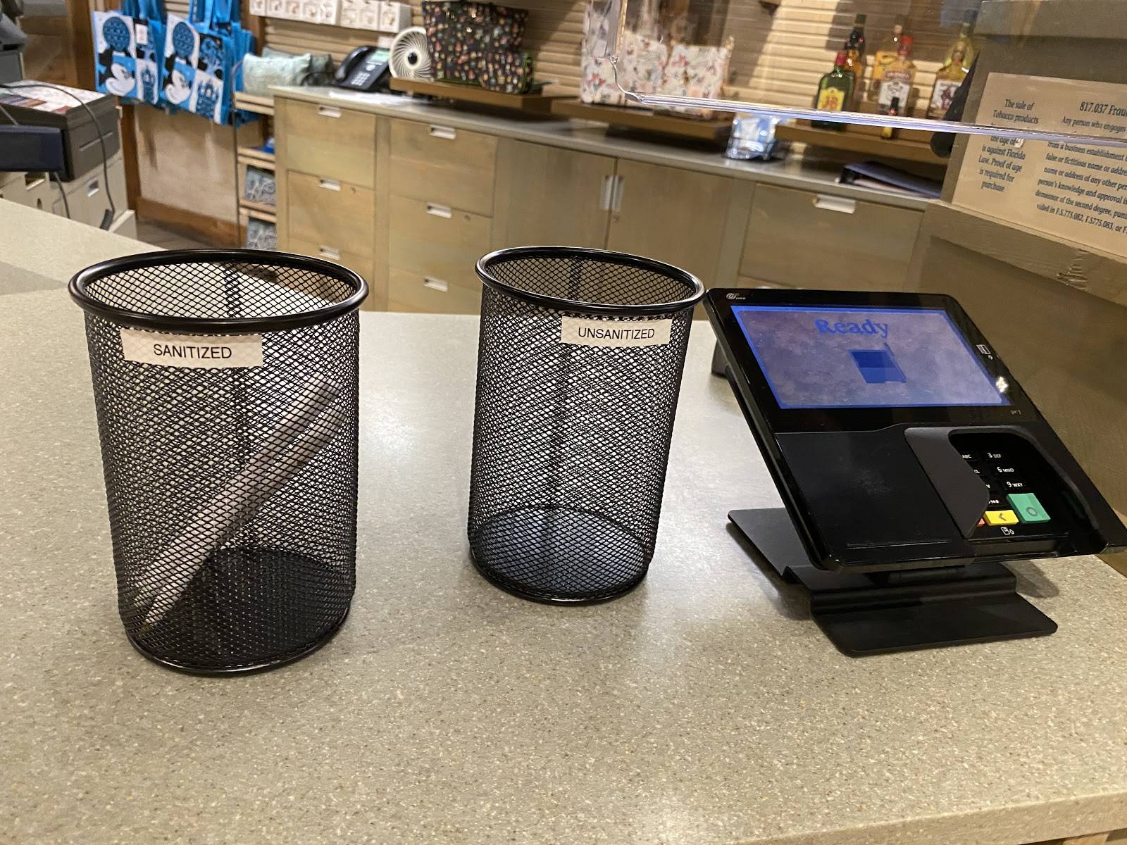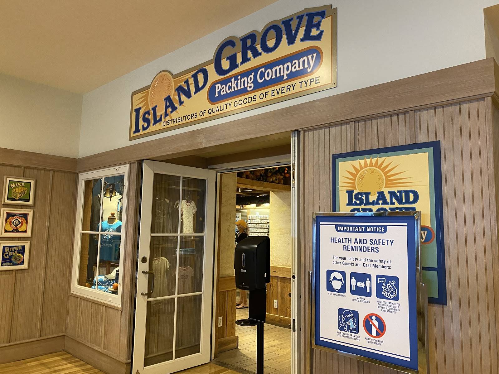 More signs and a hand sanitizing station could be found at the entrance to the Island Grove Packing Company. Inside the gift shop, more safety precautions could be found including sanitized pens and a screen in front of the cashier.
