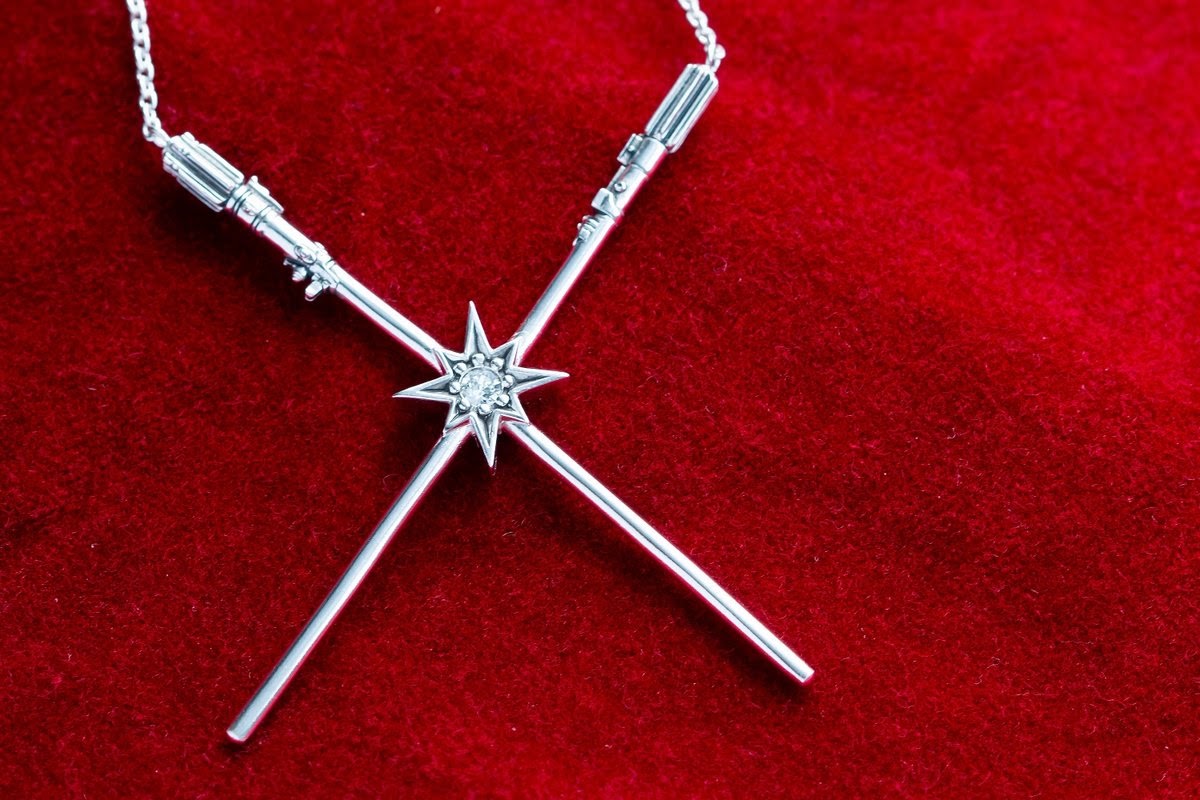 First up is the Star Wars | RockLove Luke Skywalker & Darth Vader Crossed Lightsaber Necklace, which costs $85.00 and is sculpted in sterling silver. “Luke Skywalker and Darth Vader’s iconic lightsabers clash in a pendant commemorating the 40th anniversary of Star Wars: The Empire Strikes Back. Where the three-dimensional lightsabers cross, a carved energy-burst features a brilliantly faceted white crystal. Antiqued for contrast, the pendant hangs from an adjustable sterling silver cable chain.”