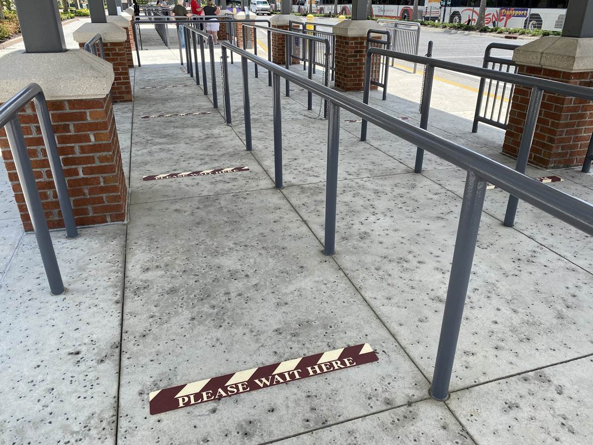 - First off, before boarding a bus, guests are being asked to maintain social distancing with markers on the ground in the queue.